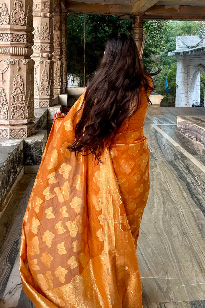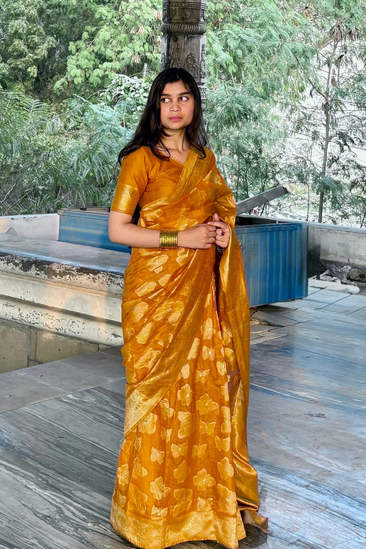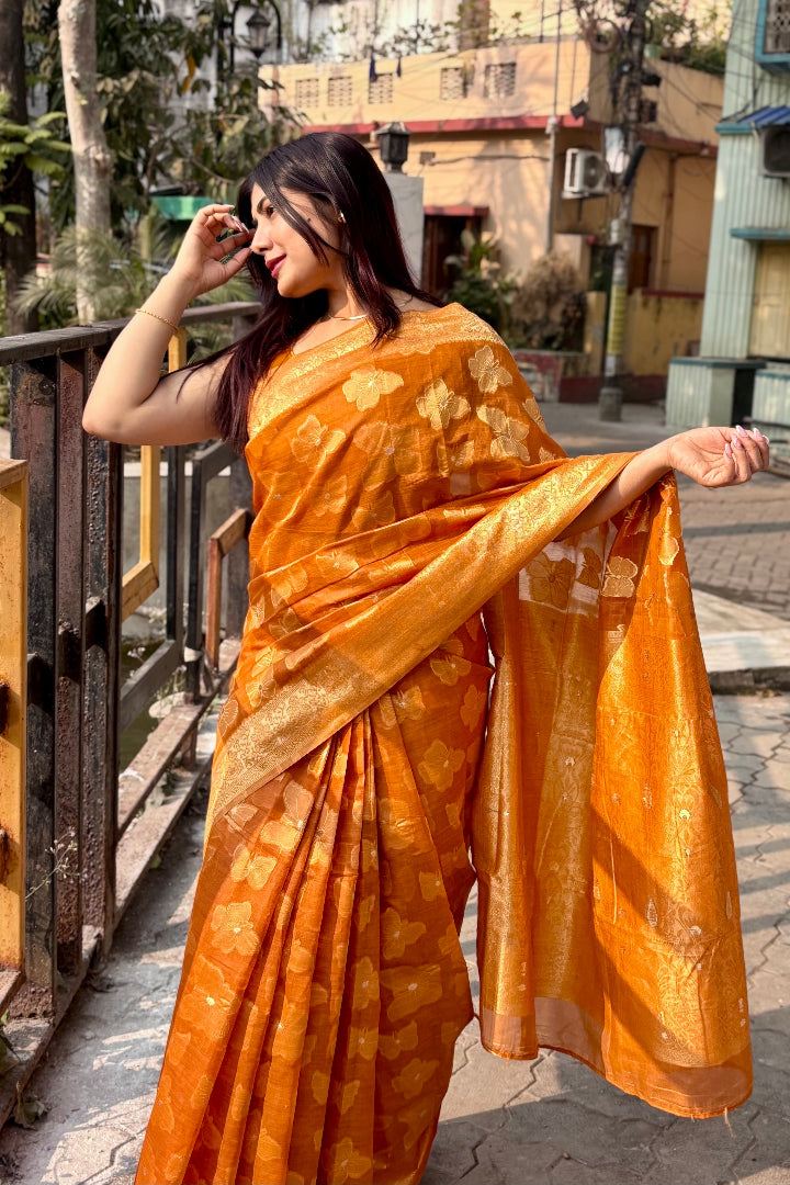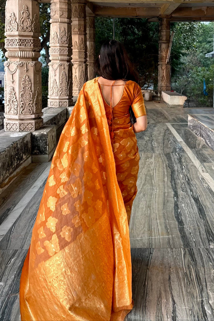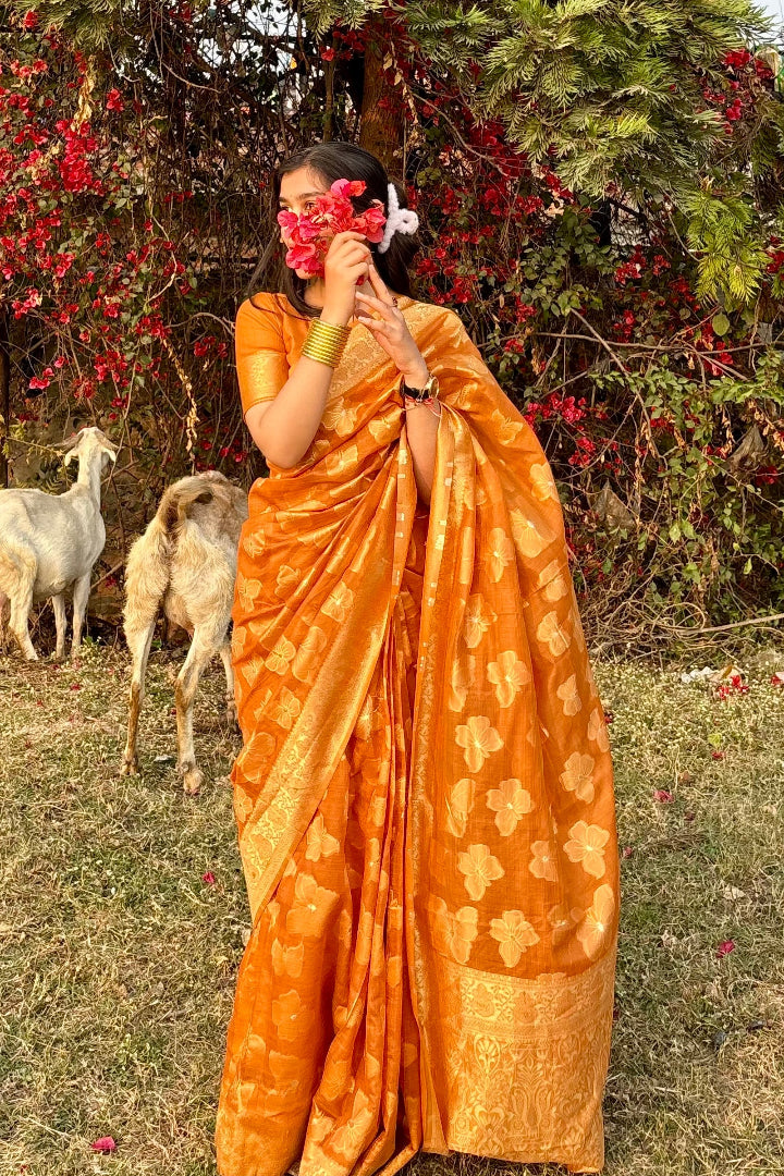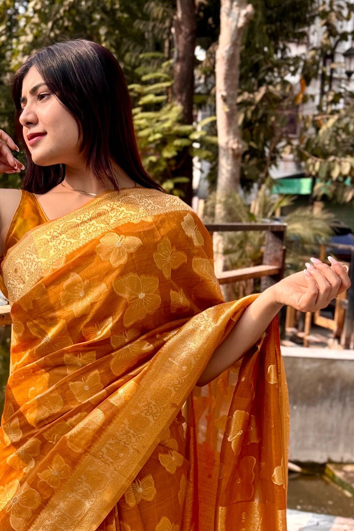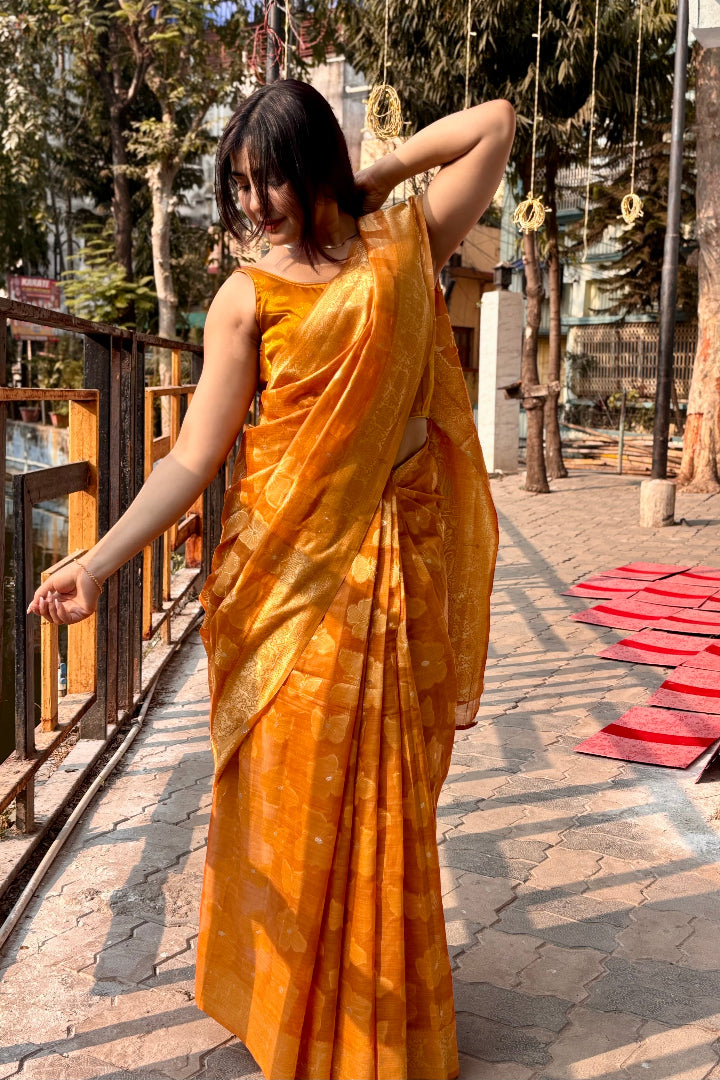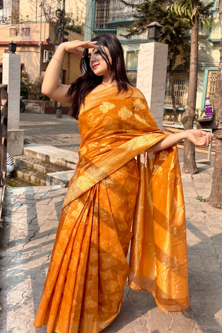 Discover timeless beauty with this Premium Banarasi Saree crafted in a soft polyester-cotton blend. Featuring intricate Banarasi weaving and a rich, elegant colour palette, this saree adds grace to every step you take.