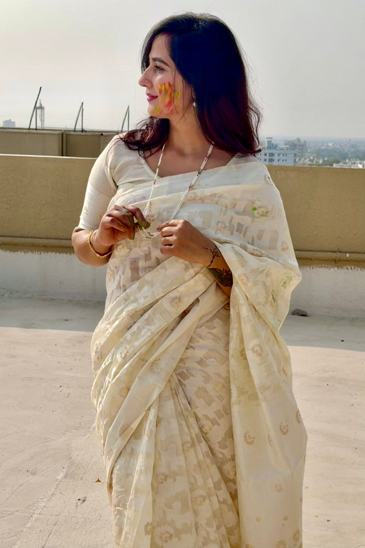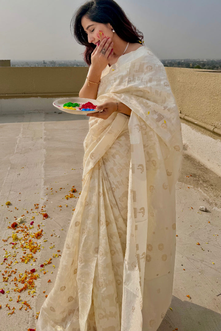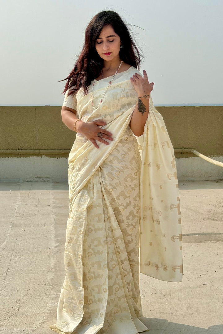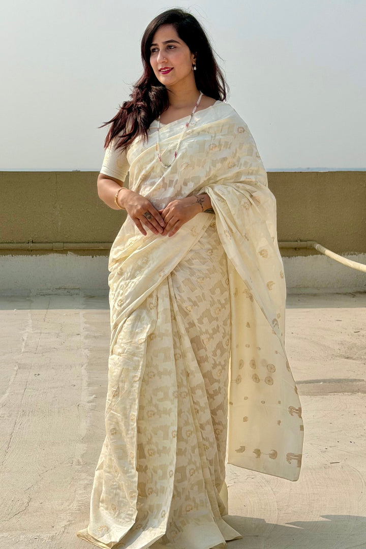 Premium Banarasi Silk Chanderi Saree – Classic Jaal Pattern, All-Season Wear