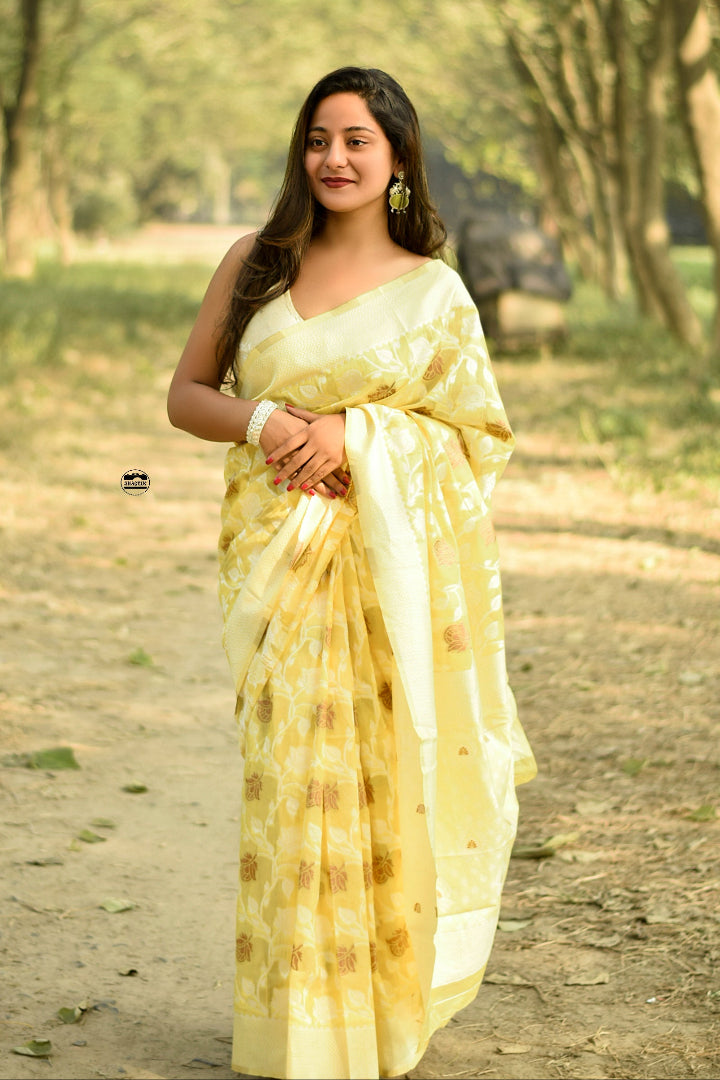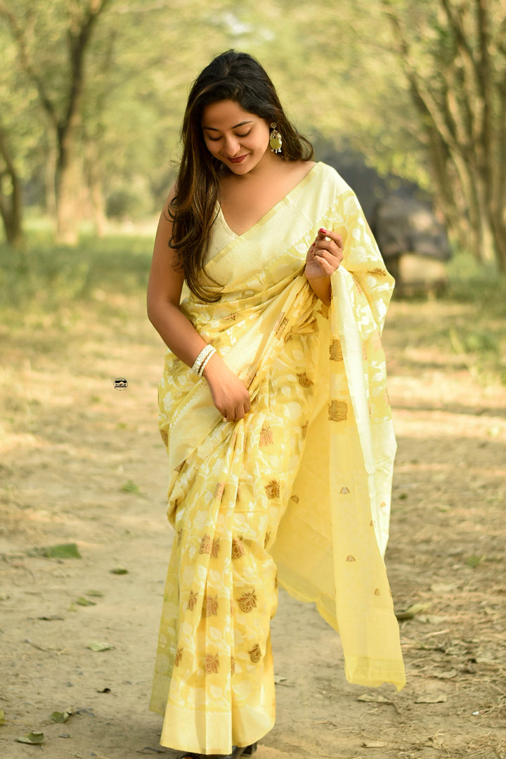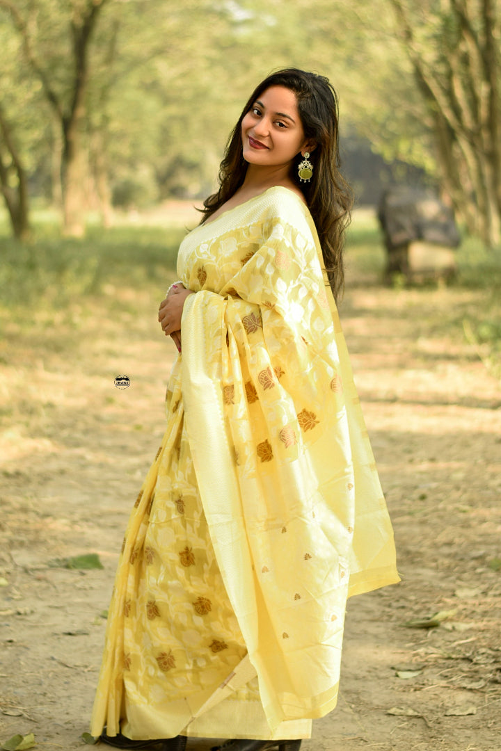 Grace in Every Drape – Banarasi Silk Chanderi Cotton Saree with Jaal Butta