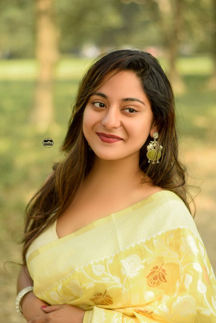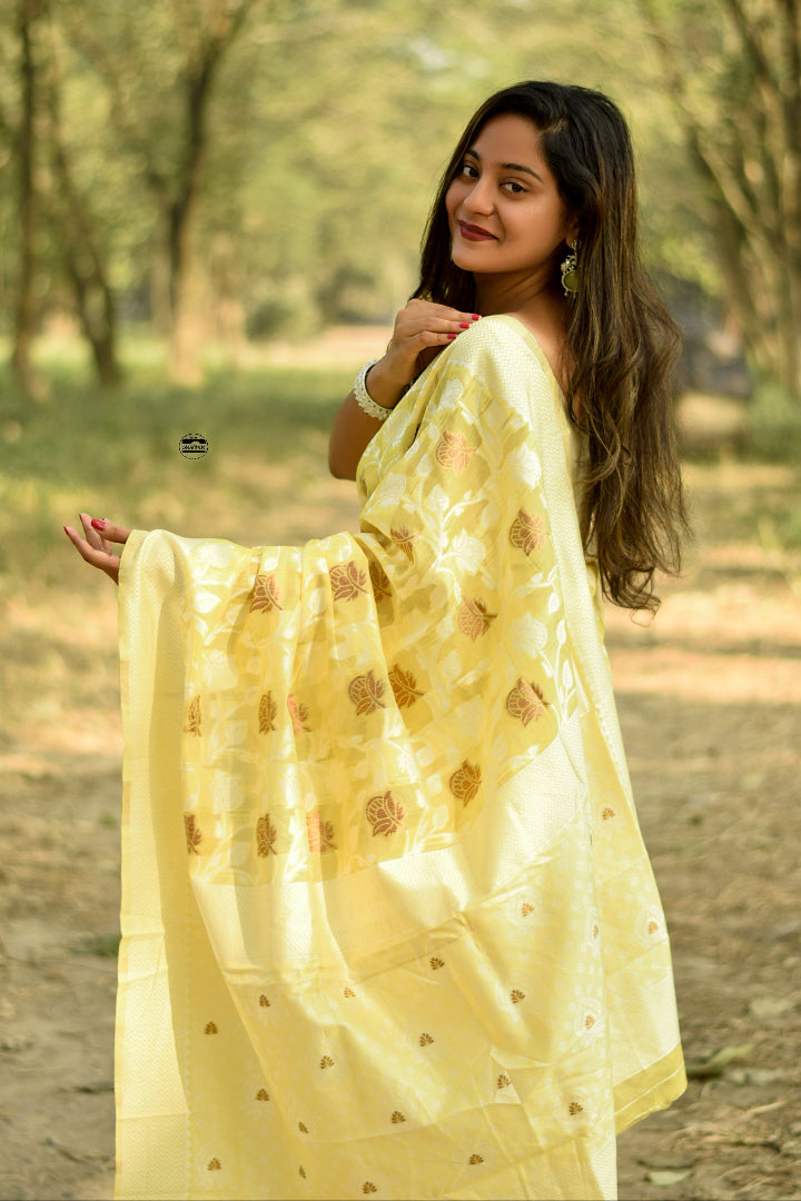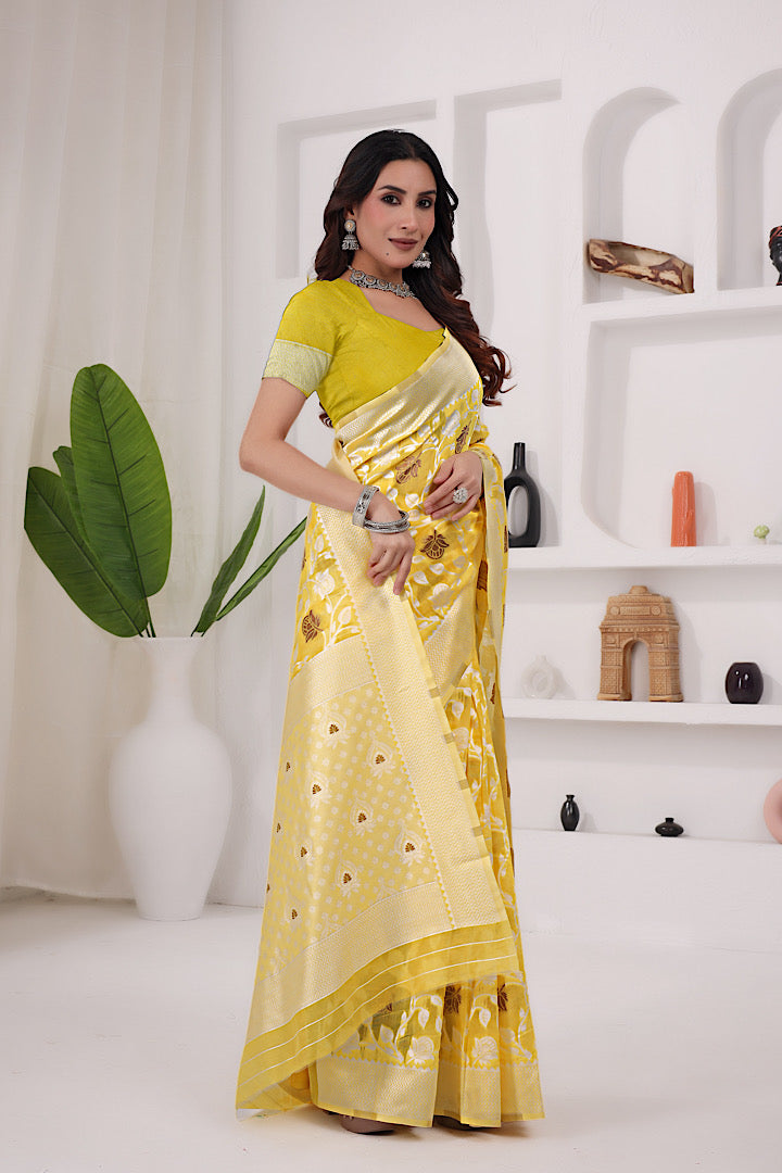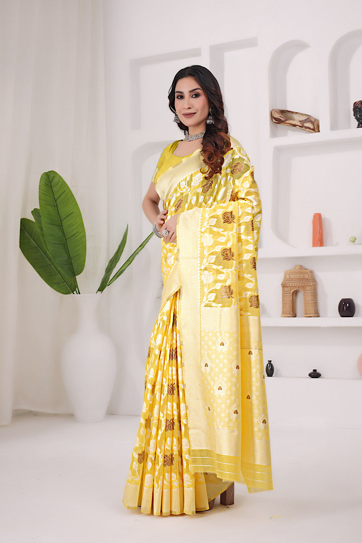 Discover timeless beauty with this Premium Banarasi Saree crafted in a soft polyester-cotton blend. Featuring intricate Banarasi weaving and a rich, elegant colour palette, this saree adds grace to every step you take.